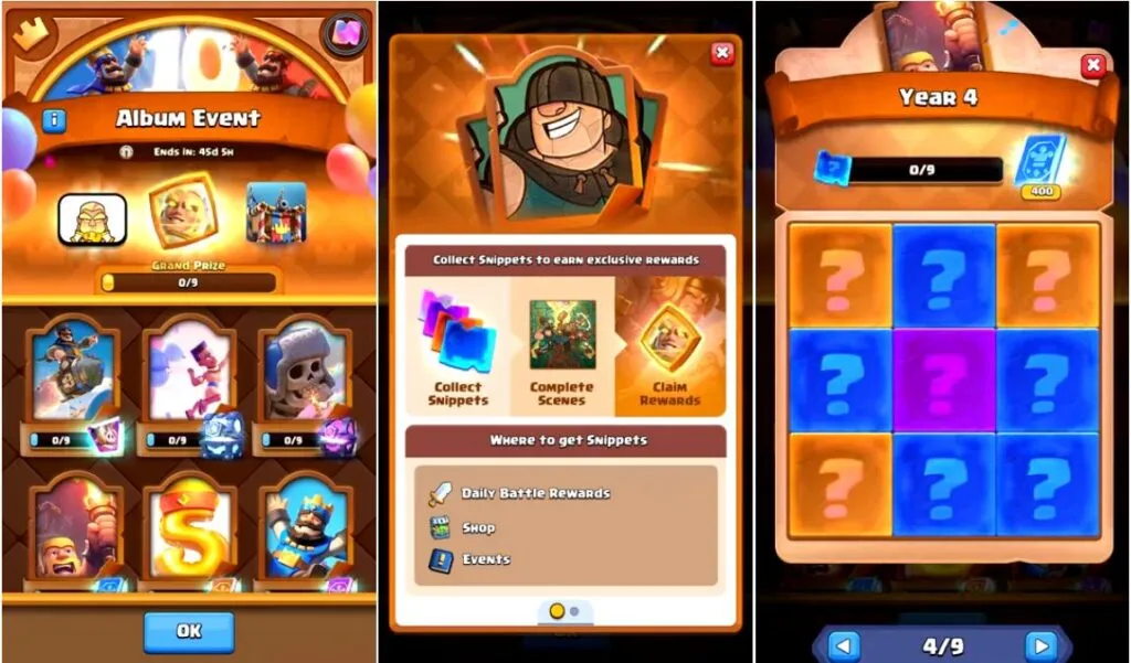 O Evento do Álbum é um evento sazonal baseado em coleções, que celebra os 10 anos de história do Clash Royale. Em vez de acumular vitórias para obter uma trilha de recompensas simples, você coleciona Fragmentos , que são peças de arte históricas do Clash Royale.